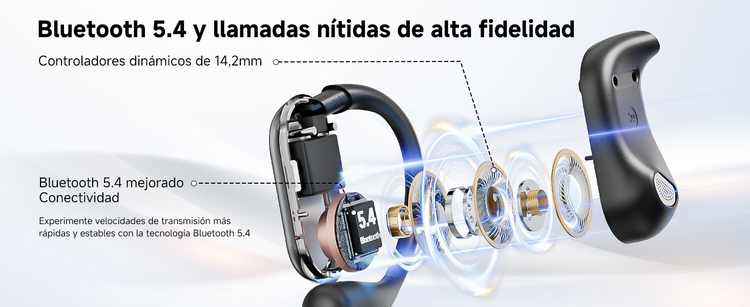 • Bluetooth 5.4 y control táctil:Experimenta velocidades de transmisión más rápidas y estables con la tecnología Bluetooth 5.4. Nuestros auriculares de conducción ósea ofrecen emparejamiento y conexión perfectos con tus dispositivos inteligentes, garantizando sonido de alta calidad con ultra baja latencia y sincronización perfecta. Disfruta de tu música sin pérdida de señal ni interrupciones. Equipados con control táctil flexible, puedes realizar todas las funciones con un suave toque.